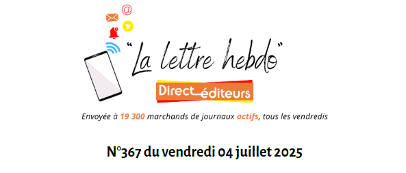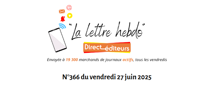 Pour découvrir la Lettre hebdo de Direct-éditeurs N°370 cliquez ici ! 📝 ACTUALITÉS : 📣 Une enquête destinée aux diffuseurs de presse – proposée par Direct-Éditeurs 🔎 ZOOM SUR les pépites du moment 🎲 Jeu concours de l’été organisé par UNI-MÉDIAS ! Les coups de ♥ de la semaine. Cliquez ici. Bonne lecture !