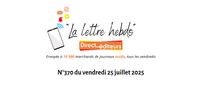 Pour découvrir la Lettre hebdo de Direct-éditeurs N°370 cliquez ici ! 📝 ACTUALITÉS : 📣 Une enquête destinée aux diffuseurs de presse – proposée par Direct-Éditeurs 🔎 ZOOM SUR les pépites du moment 🎲 Jeu concours de l’été organisé par UNI-MÉDIAS ! Les coups de ♥ de la semaine. Cliquez ici. Bonne lecture !